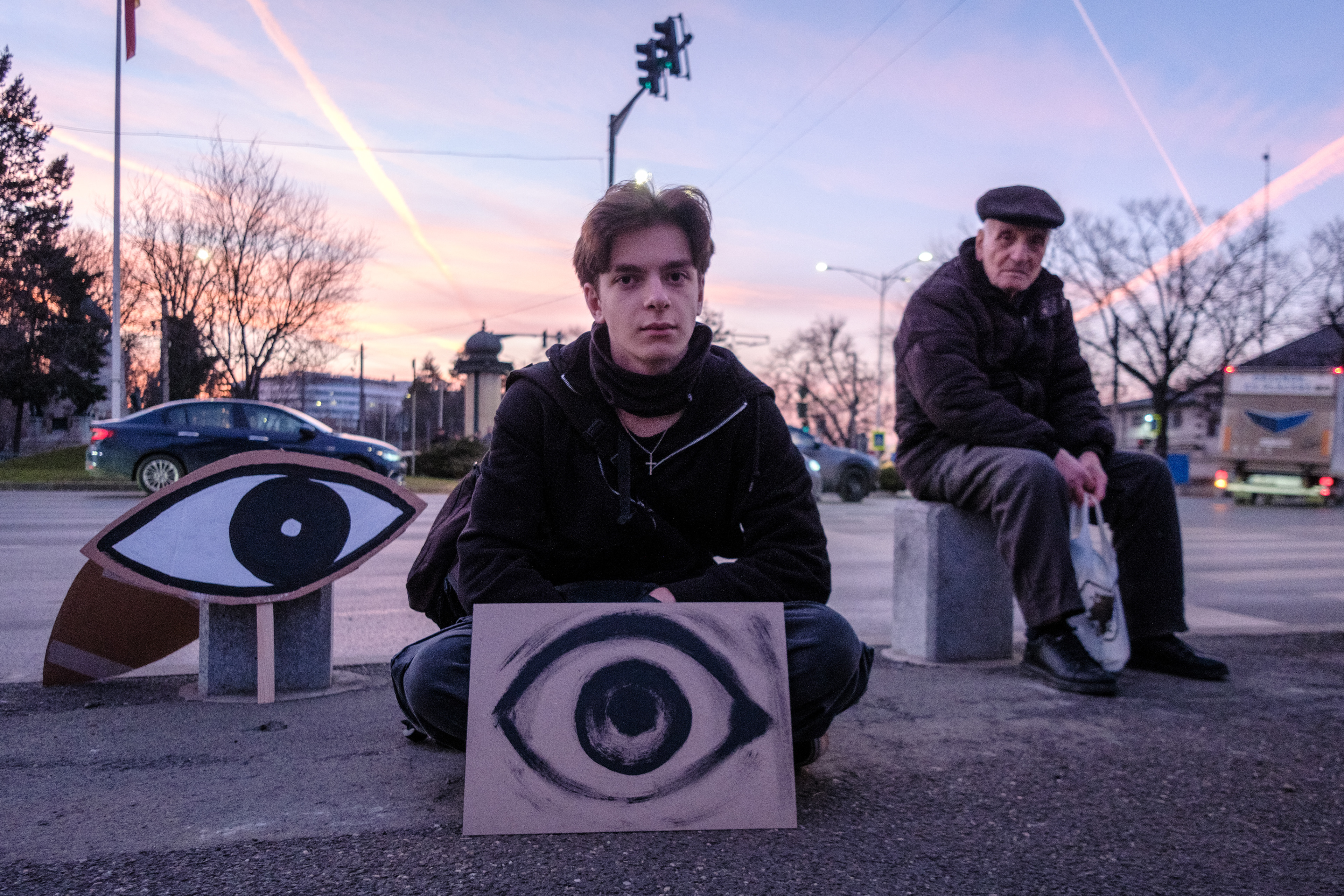 A man holds a placard that reads 'Romania, you can do better than a supporters' boss', referring to George Simion, candidate in the presidential elections, at the event "One Road: EUROPE" organized in Bucharest by several civil society associations, May 9th, 2025.