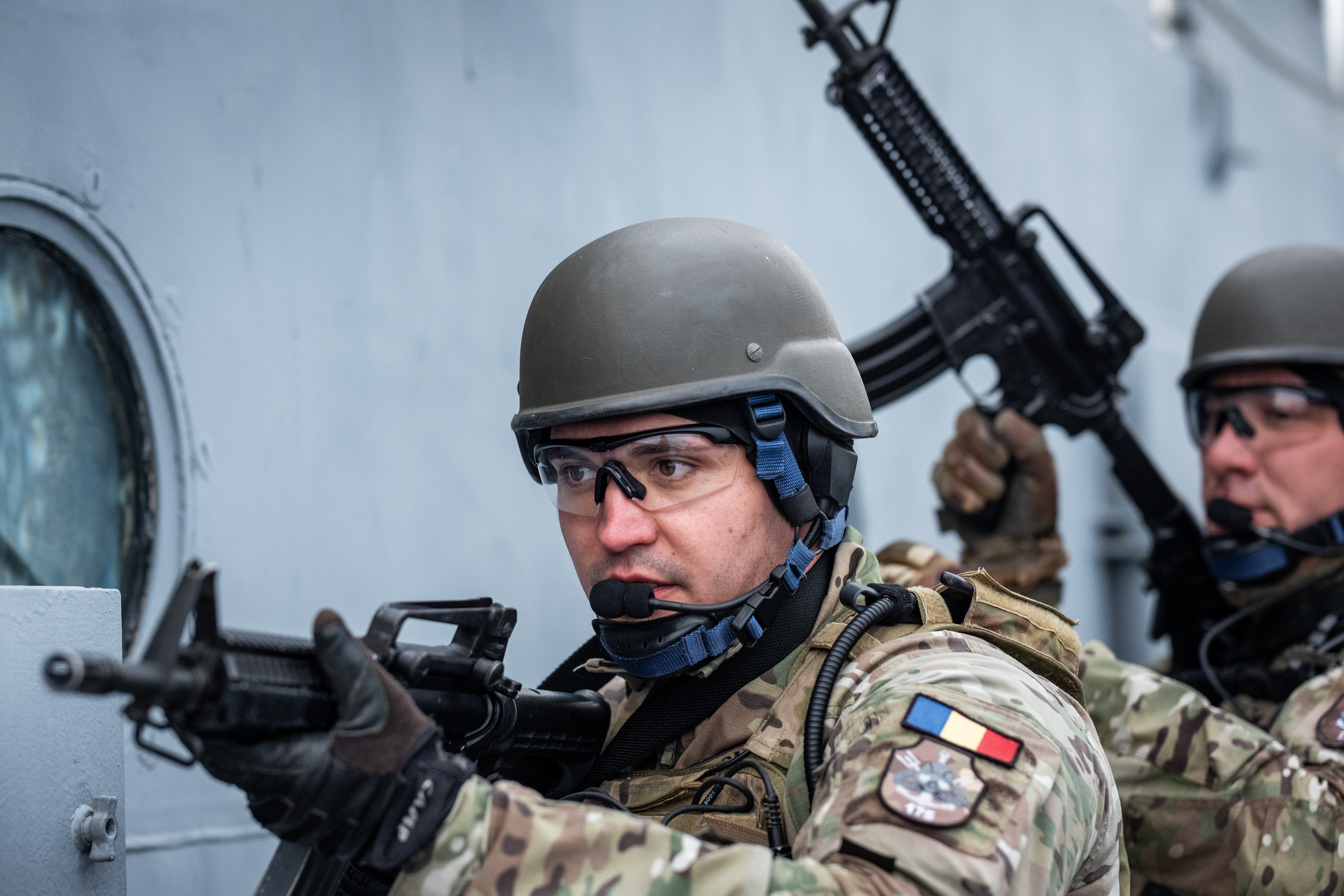 Romanian military personnel aboard the frigate 'Marasesti' participate in the multinational exercise Sea Shield 2026, off the coast of Romania’s territorial waters, near Constanta, March 24, 2026.