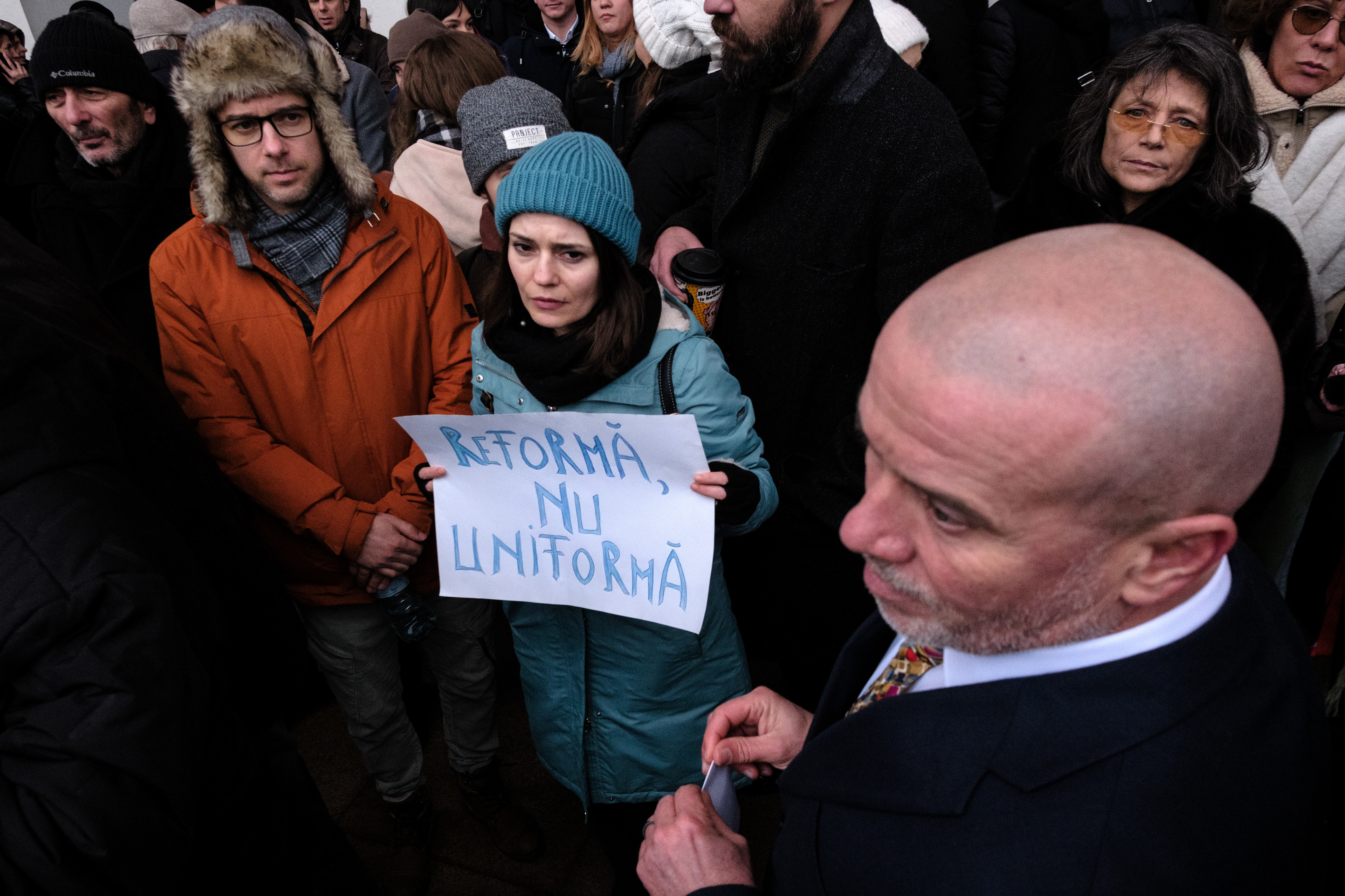 Minister of Culture András István Demeter (R) attends a protest organized by actors from the Bucharest National Theatre. A woman holds a placard that reads 'Reform, not uniform' (Reforma, NU uniforma), in Bucharest, February 10, 2026.