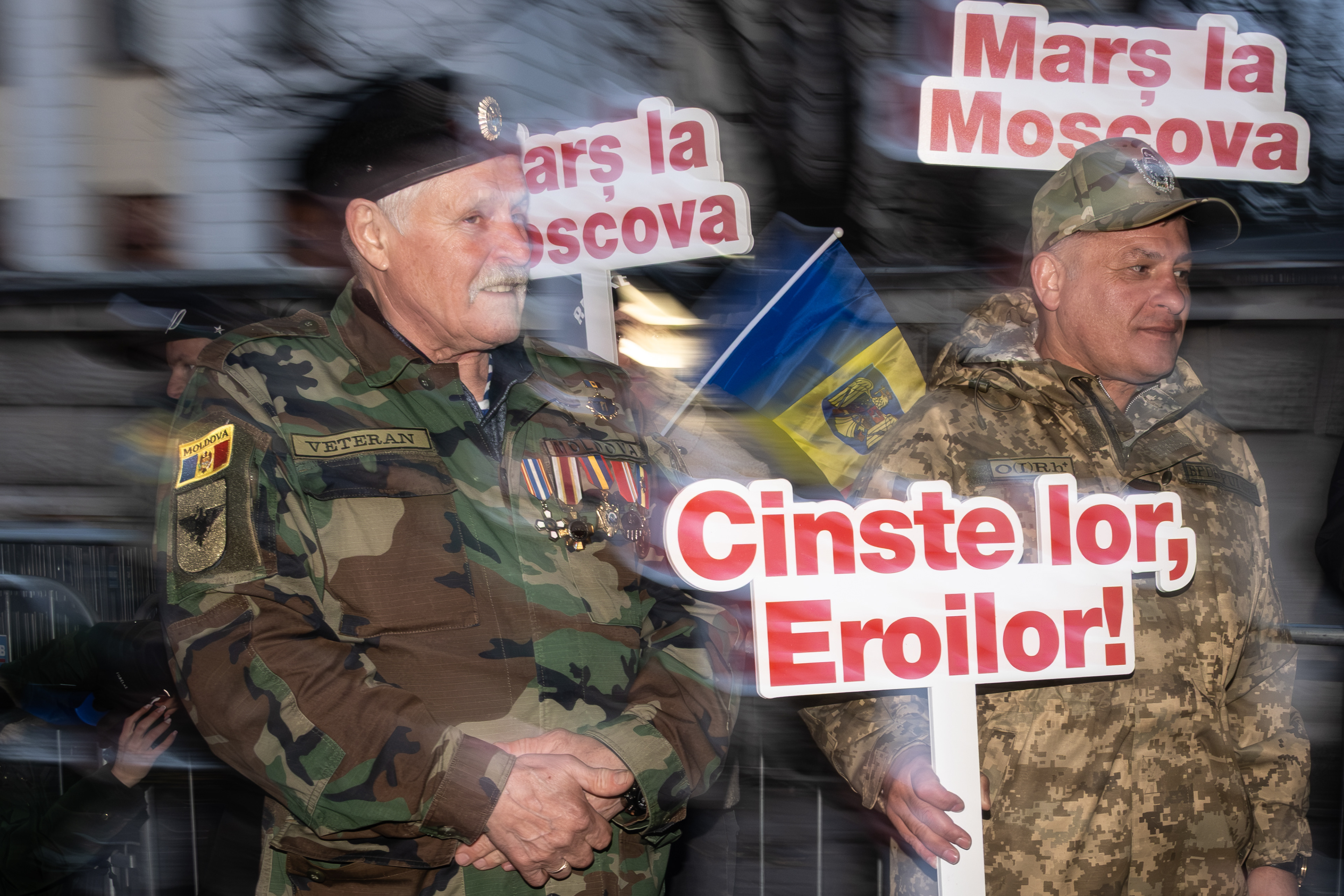 War veterans gather outside the Embassy of the Russian Federation during a protest organized by a nationalist group against politicians and media members accused of promoting a Russian agenda. One veteran holds a placard reading 'Honor to the Heroes' (Cinste Eroilor) in Bucharest, Romania, March 2, 2026.
