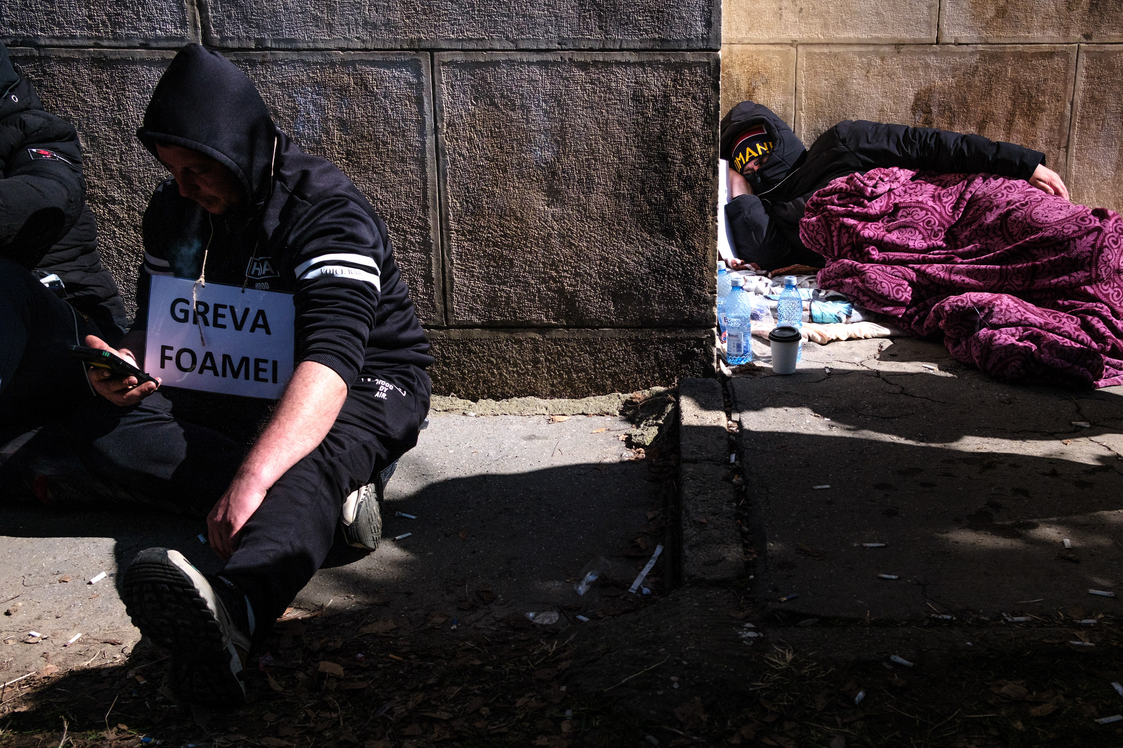 Miners on a hunger strike protest in front of the Ministry of Energy, dissatisfied with the decision to close coal mines, in Bucharest, March 13, 2026.