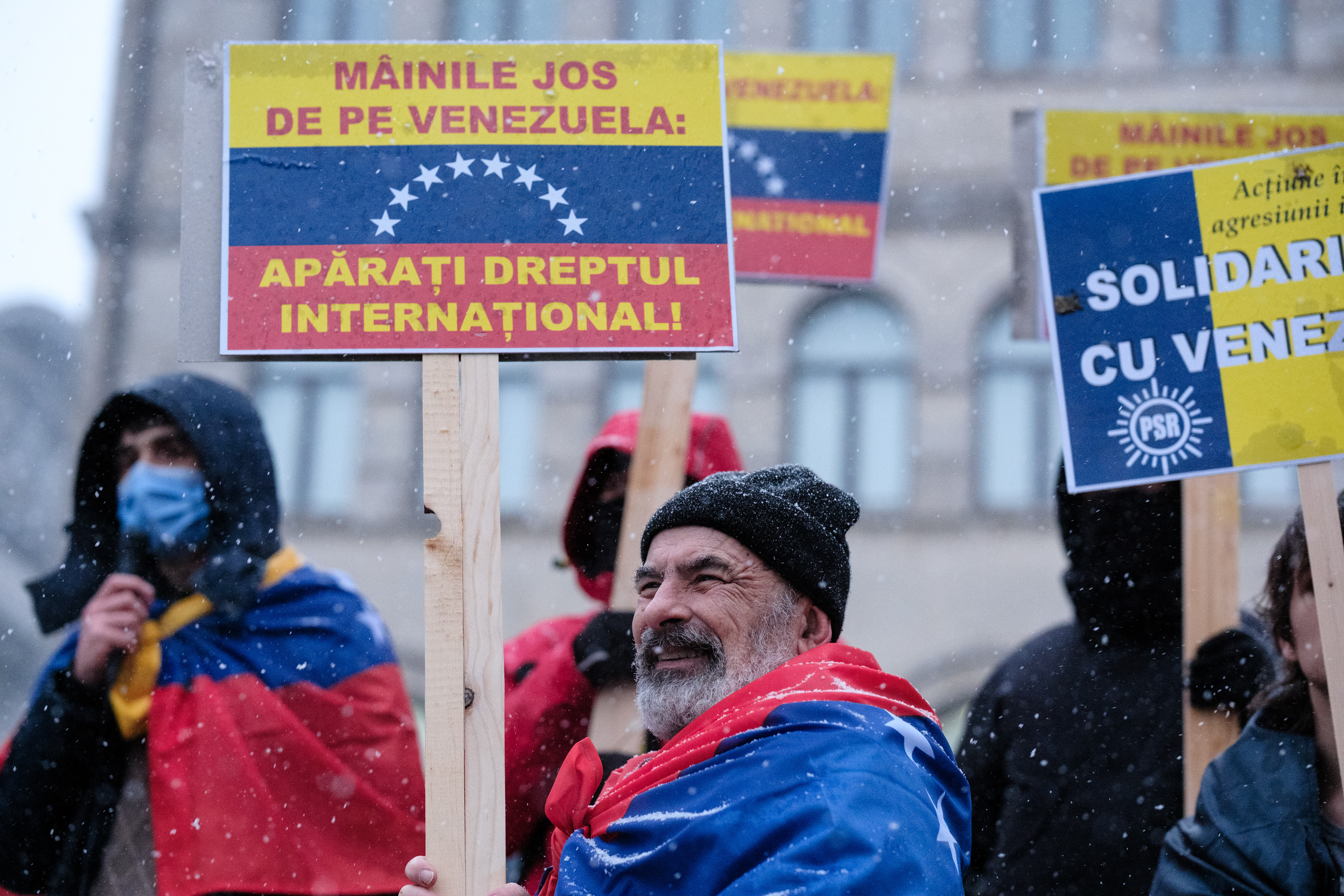 Approximately 20 people, members of the Romanian Socialist Party, protest in support of Venezuela following the abduction of President Nicolas Maduro by the U.S., in University Square, January 8, 2026.